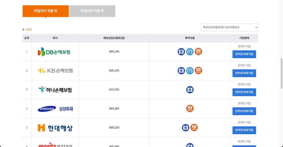 마일리지 적용 전과 후로 가격 비교를 할 수 있고, 보험회사 별로 다시한번 정보 확인을 통해 확실히 알 수 있습니다.